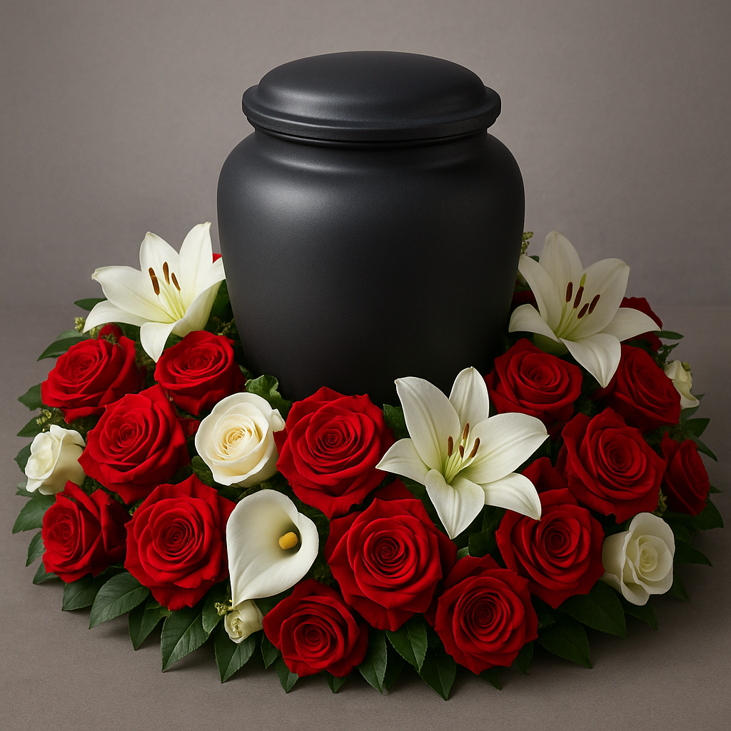 Urnenkranz aus Rosen, Lilien, Callas oder saisonalen Blumen (Feuerbestattung)