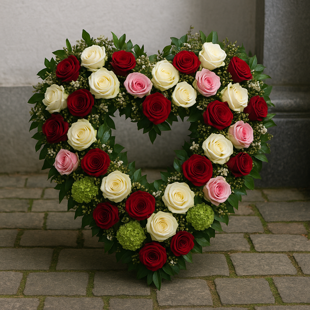 Trauerkranz oder Trauerherz stehend mit Blumen bestückt und auf Wunsch mit Schleifentexten