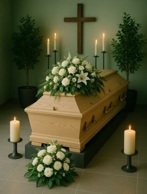 Sargschmuck aus Rosen, Lilien, Callas oder saisonalen Blumen (Erdbestattung)